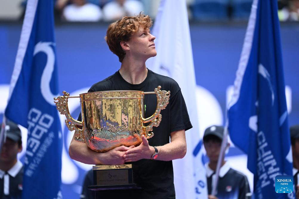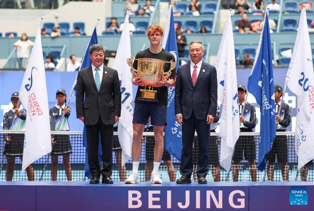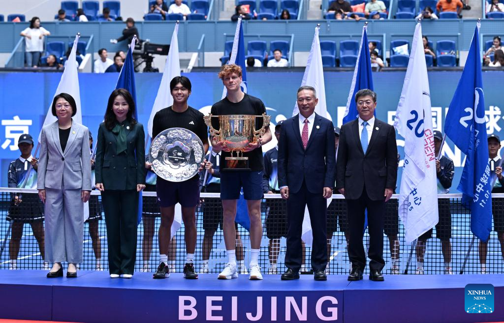 Jannik Sinner poses for photo during the award ceremony for the men's singles final match between Jannik Sinner of Italy and Learner Tien of the United States at 2025 China Open tennis tournament in Beijing, China, Oct. 1, 2025. (Xinhua/Du Xinyi)