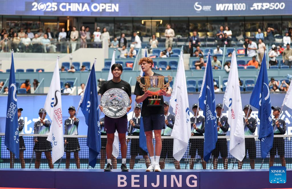 Jannik Sinner (R) and Learner Tien pose for photo during the award ceremony for the men's singles final match between Jannik Sinner of Italy and Learner Tien of the United States at 2025 China Open tennis tournament in Beijing, China, Oct. 1, 2025. (Xinhua/Du Xinyi)