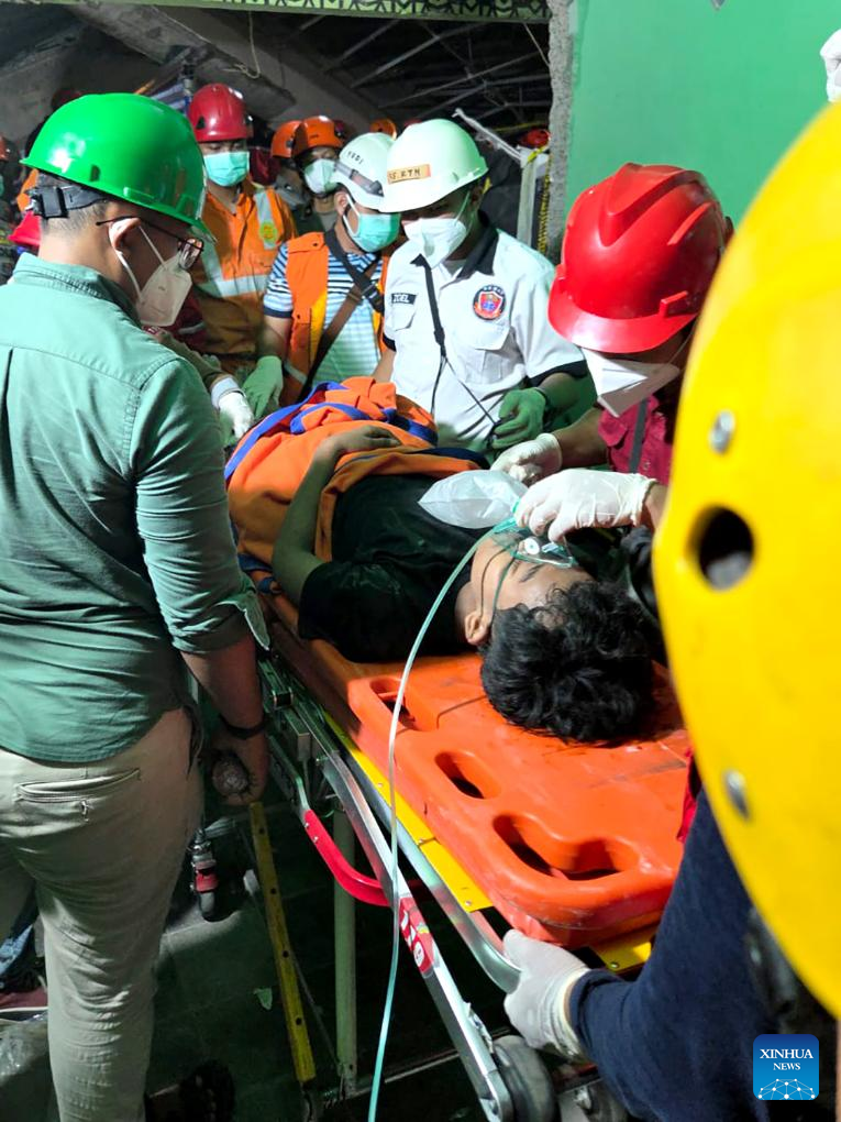 Photo provided by Indonesia's National Search And Rescue Agency (Basarnas) shows members of rescue team evacuating a survivor after a collapsed school building at Al Khoziny Islamic Boarding School in Sidoarjo district, East Java, Indonesia, Oct. 1, 2025. The death toll from the collapse of a school building in Indonesia's East Java province has risen to five, with 84 people still trapped under the rubble, the regional rescue agency said on Wednesday. (Photo by Basarnas/ Handout via Xinhua)