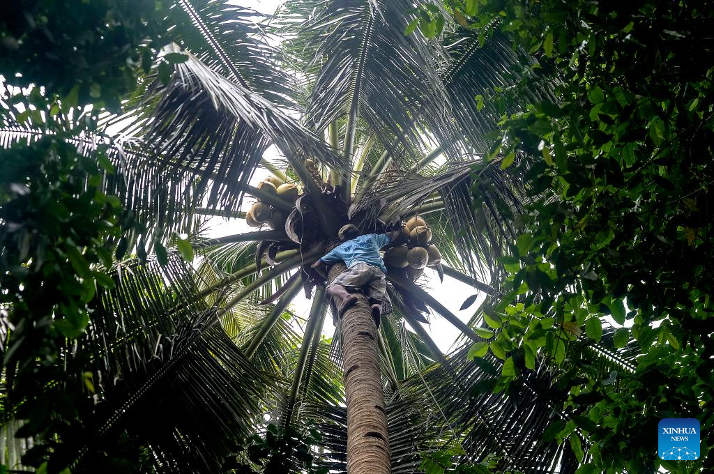 A worker harvests coconuts at a plantation in Bantul regency, Yogyakarta, Indonesia, Sept. 30, 2025. (Photo by Agung Supriyanto/Xinhua)