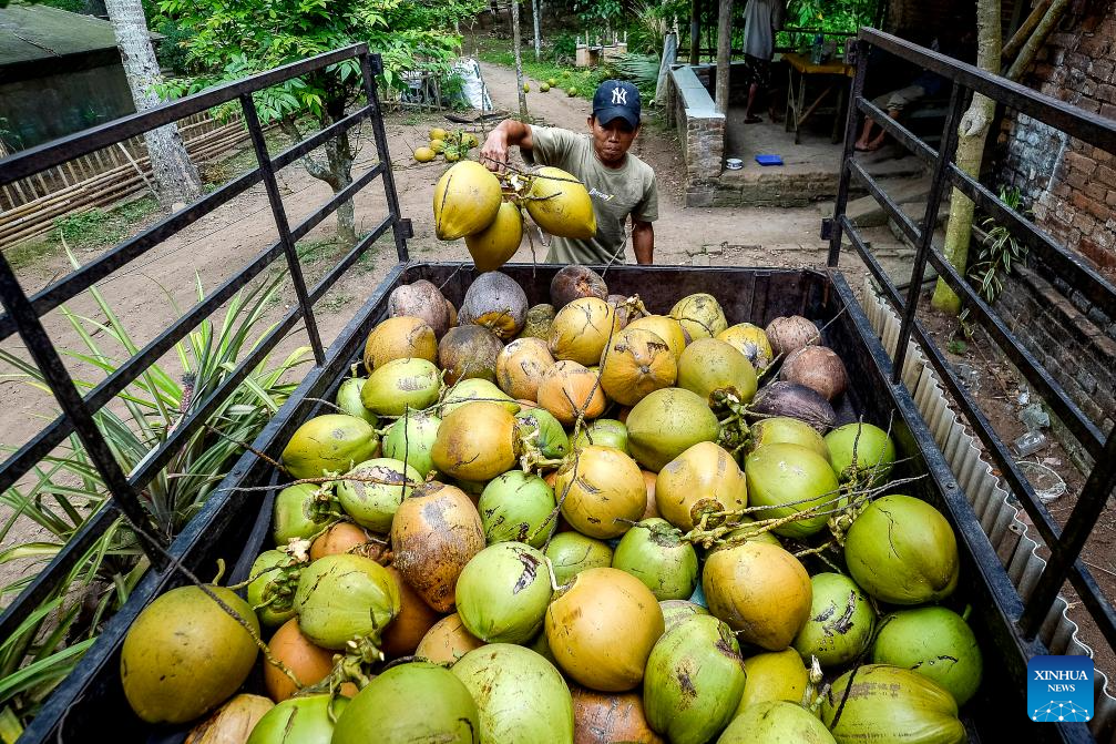 A worker loads harvested coconuts onto a vehicle at a plantation in Bantul regency, Yogyakarta, Indonesia, Sept. 30, 2025. (Photo by Agung Supriyanto/Xinhua)