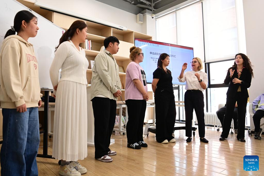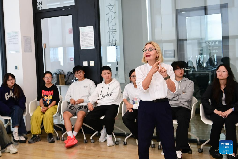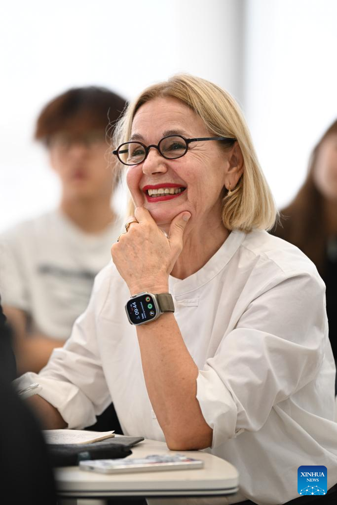 Vitomira Loncar listens to her students' presentations at Xi'an Eurasia University in Xi'an, northwest China's Shaanxi Province, Sept. 25, 2025.(Xinhua/Zou Jingyi)