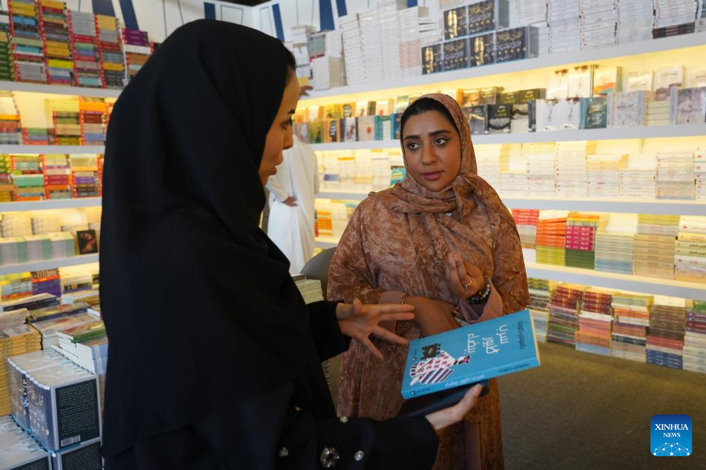 People read a book at the Riyadh International Book Fair 2025 in Riyadh, Saudi Arabia, Oct. 2, 2025. The book fair opened here on Thursday, bringing together over 2,000 local and international publishing houses from more than 25 countries, along with a range of cultural institutions. (Xinhua/Luo Chen)