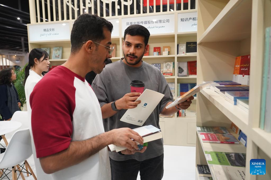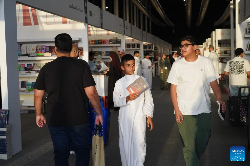 People visit the Riyadh International Book Fair 2025 in Riyadh, Saudi Arabia, Oct. 2, 2025. The book fair opened here on Thursday, bringing together over 2,000 local and international publishing houses from more than 25 countries, along with a range of cultural institutions. (Xinhua/Luo Chen)