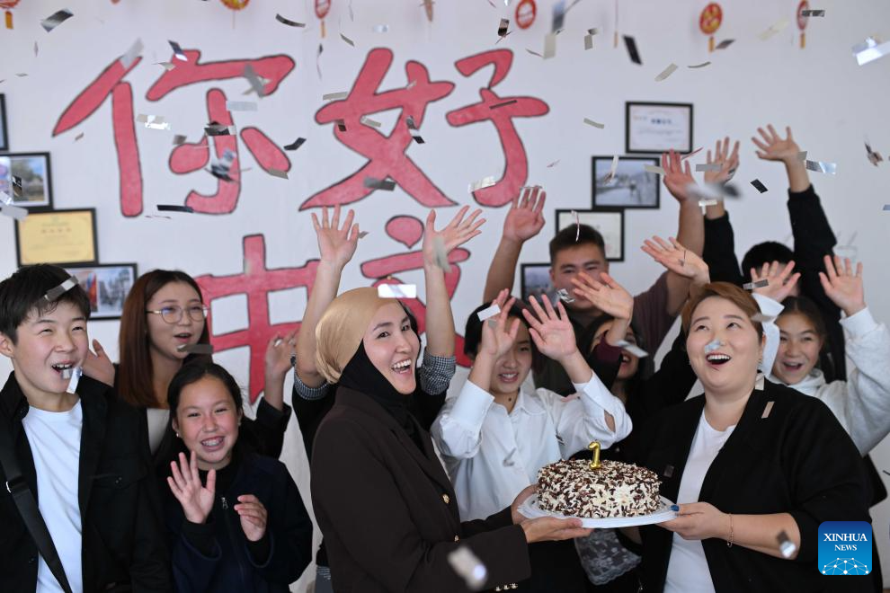 Aidai Kubanychbekova (front, 1st R) and her colleagues celebrate the one-year anniversary of the "Hello, Chinese language!" learning center together with students in Karakol, Kyrgyzstan, on Sept. 22, 2025. (Xinhua/Li Renzi)