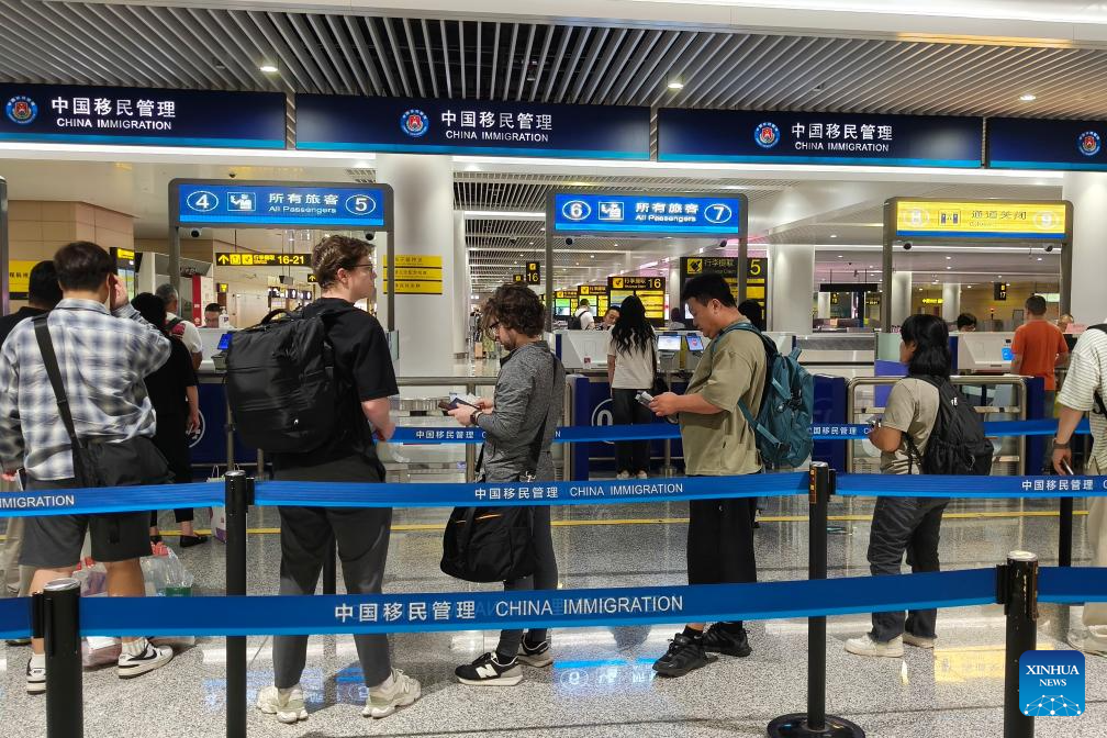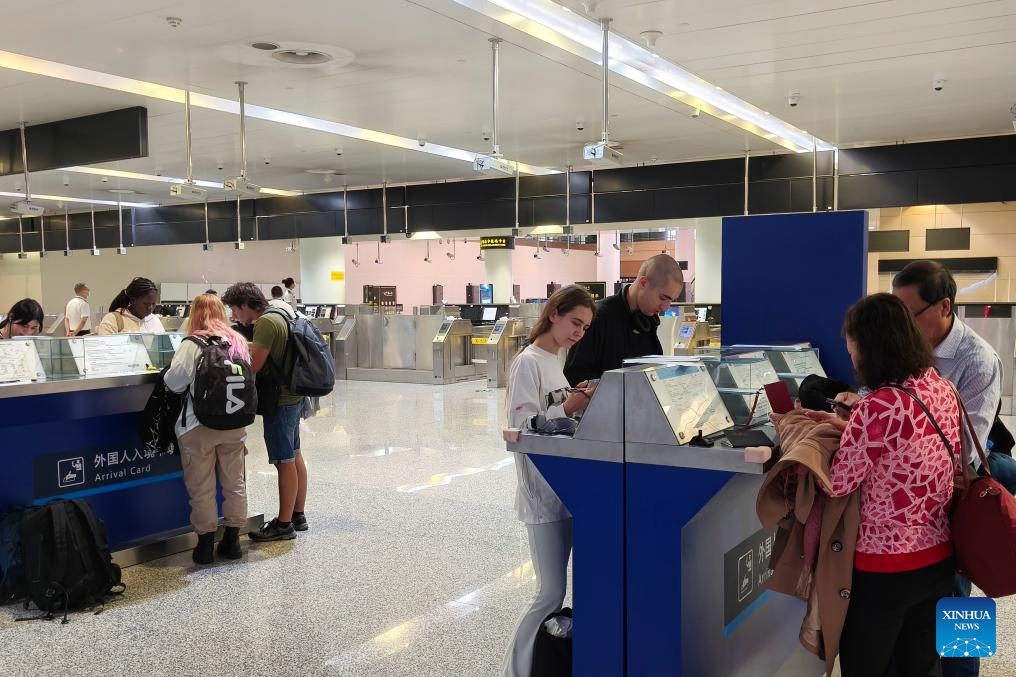 Foreign travellers wait to go through the immigration check at Chongqing Jiangbei International Airport in southwest China's Chongqing, Oct. 1, 2025.