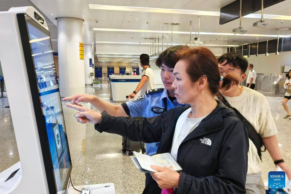 A police officer helps a South Korean tourist with entry registration at Chongqing Jiangbei International Airport in southwest China's Chongqing, Oct. 1, 2025.