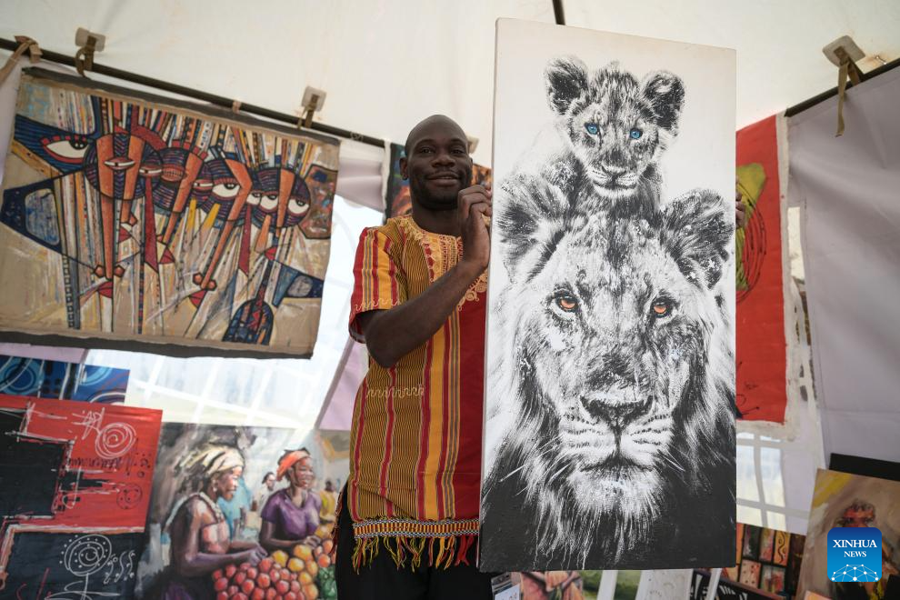 An exhibitor displays paintings with African characteristics at the 15th edition of the Magical Kenya Travel Expo in Nairobi, Kenya, Oct. 2, 2025. Kenya is hosting the three-day expo, running until Friday, which has attracted 6,500 delegates from 40 countries, including tourism ministers, city mayors, investors, travel enthusiasts, and promoters. (Xinhua/Yang Guang)