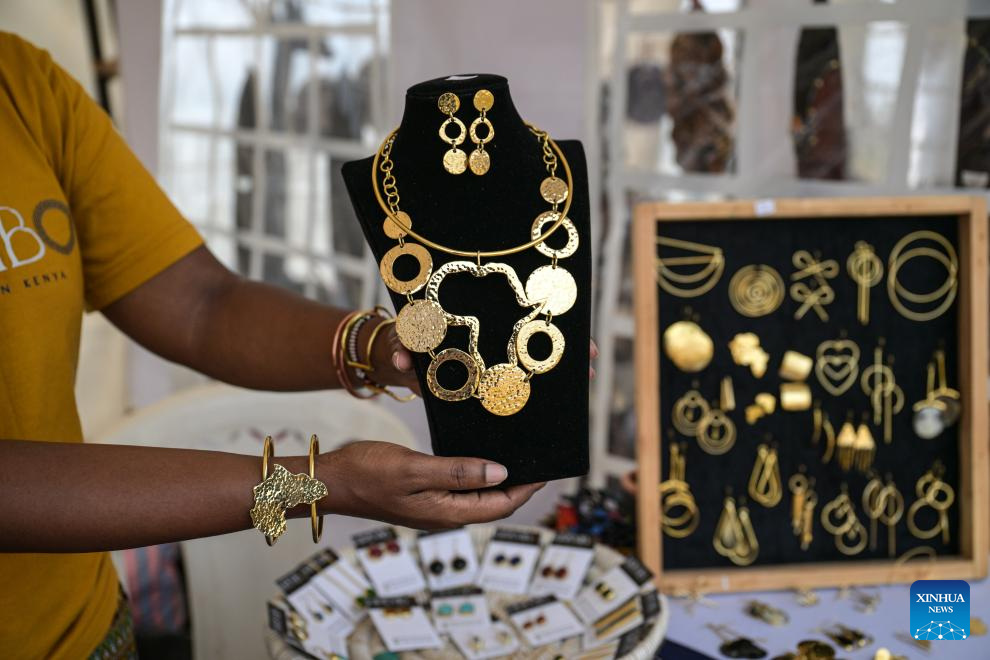 An exhibitor displays African-style jewelry at the 15th edition of the Magical Kenya Travel Expo in Nairobi, Kenya, Oct. 2, 2025. Kenya is hosting the three-day expo, running until Friday, which has attracted 6,500 delegates from 40 countries, including tourism ministers, city mayors, investors, travel enthusiasts, and promoters. (Xinhua/Yang Guang)