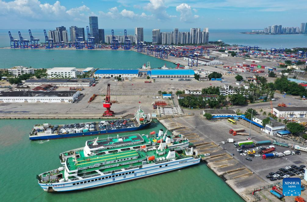 An aerial drone photo taken on Oct. 4, 2025 shows passengers ships at Xiuying Port of Haikou, south China's Hainan Province. As Typhoon Matmo, the 21st named storm of the 2025 Pacific typhoon season, approaches, the provincial committee for disaster prevention, mitigation and relief upgraded their emergency typhoon response for vessels and marine operations in affected sea areas to Level III from a Level-IV emergency response at 8:30 a.m. on Saturday. (Xinhua/Guo Cheng)