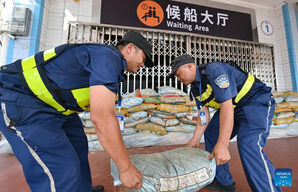 Staff lay sandbags outside the waiting area of Xiuying Port in Haikou, south China's Hainan Province, Oct. 4, 2025. As Typhoon Matmo, the 21st named storm of the 2025 Pacific typhoon season, approaches, the provincial committee for disaster prevention, mitigation and relief upgraded their emergency typhoon response for vessels and marine operations in affected sea areas to Level III from a Level-IV emergency response at 8:30 a.m. on Saturday. (Xinhua/Guo Cheng)