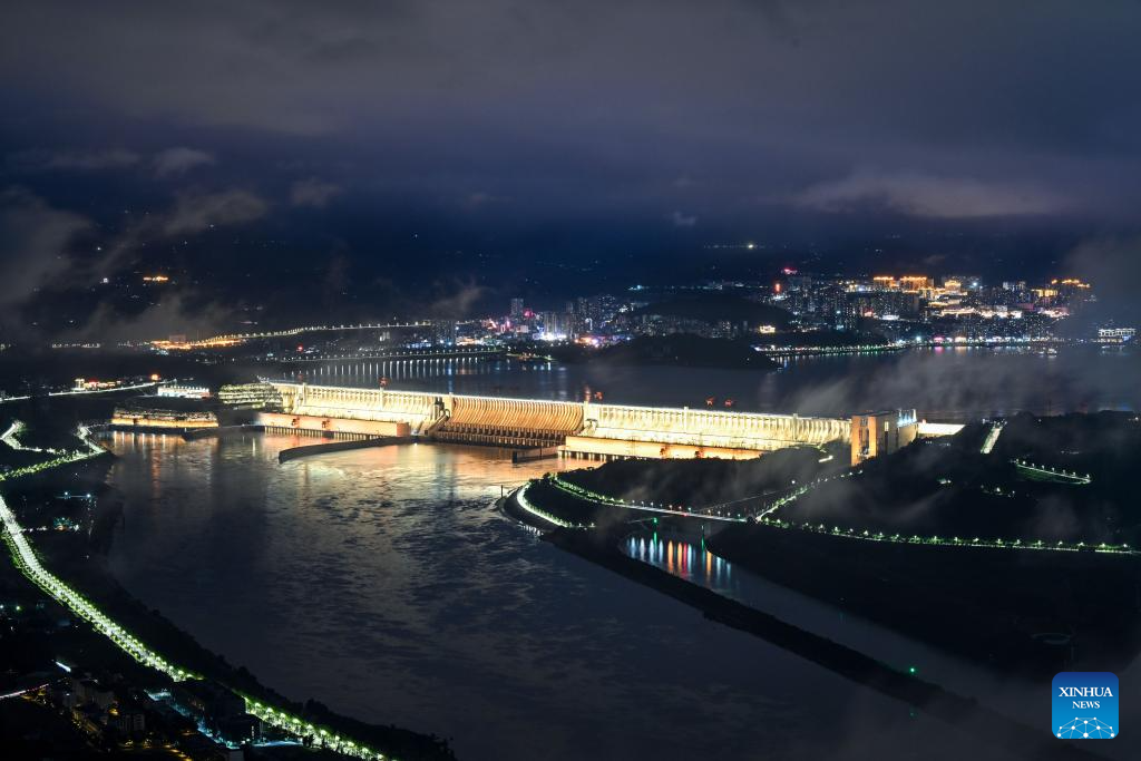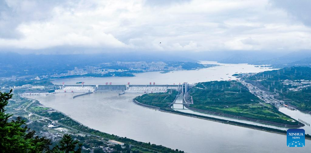 This photo taken on Oct. 4, 2025 shows a view of the Three Gorges Dam and its ship lock in Yichang of central China's Hubei Province. (Xinhua/Chen Yehua)