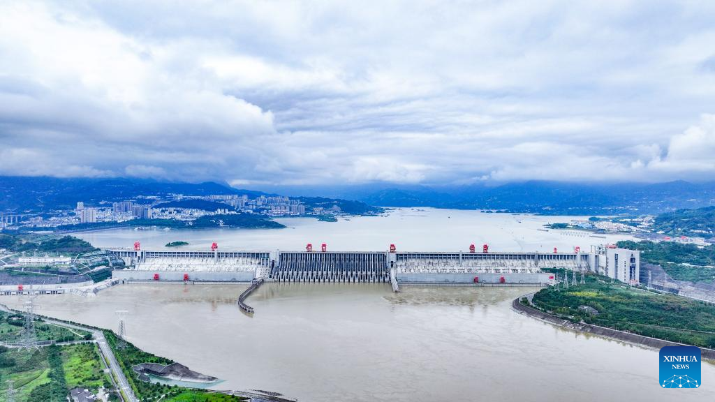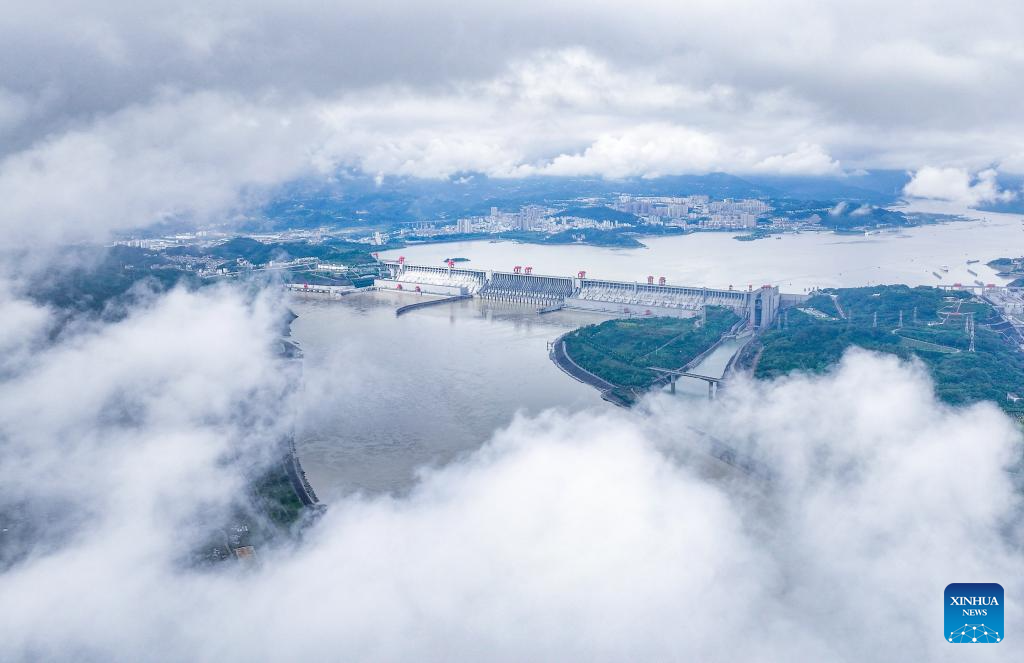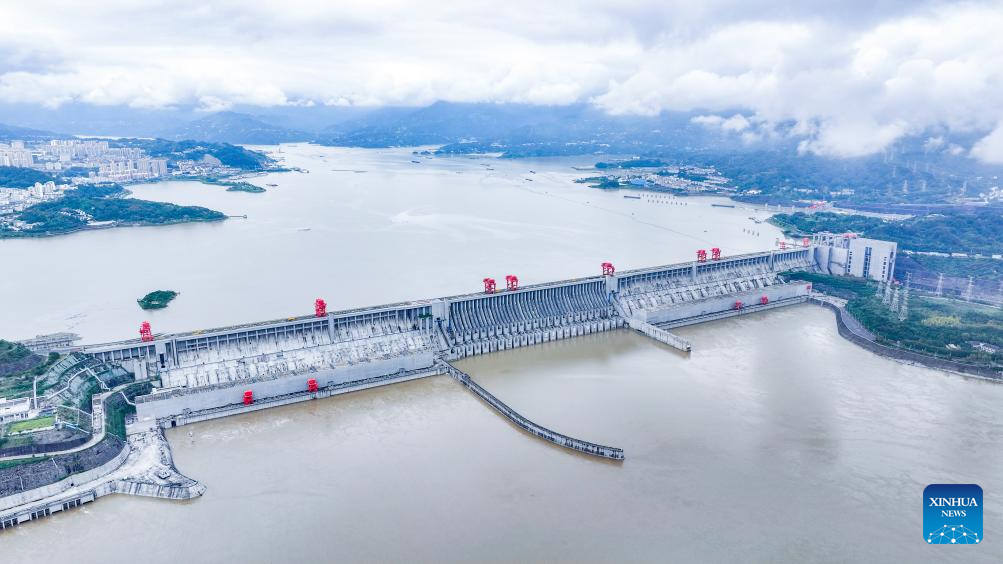 An aerial drone photo taken on Oct. 4, 2025 shows a view of the Three Gorges Dam in Yichang of central China's Hubei Province. (Xinhua/Chen Yehua)