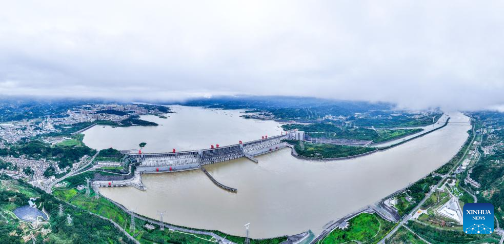 An aerial panorama photo taken on Oct. 3, 2025 shows a view of the Three Gorges Dam in Yichang of central China's Hubei Province. (Xinhua/Chen Yehua)