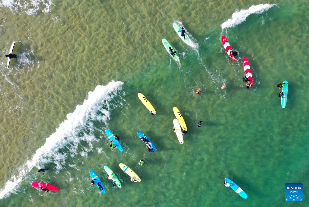 An aerial drone photo shows tourists surfing at Riyue Bay in Wanning, south China's Hainan Province, Oct. 2, 2025. Surfing has become a symbol of Wanning thanks to its unique geographical and climatic advantages. (Xinhua/Guo Cheng)