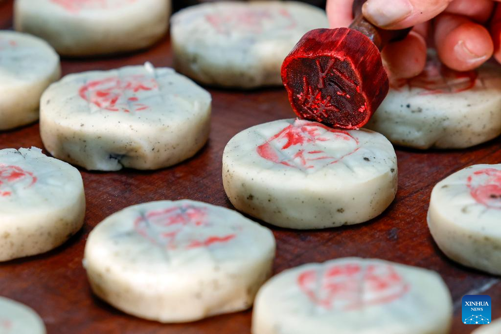 Pastry artisan Cheng Guisheng makes "Huizhou-style Sesame Seed Mooncakes" at Wan'an Old Street in Xiuning County of Huangshan City, east China's Anhui Province, Sept. 25, 2025.(Photo by Shi Yalei/Xinhua)