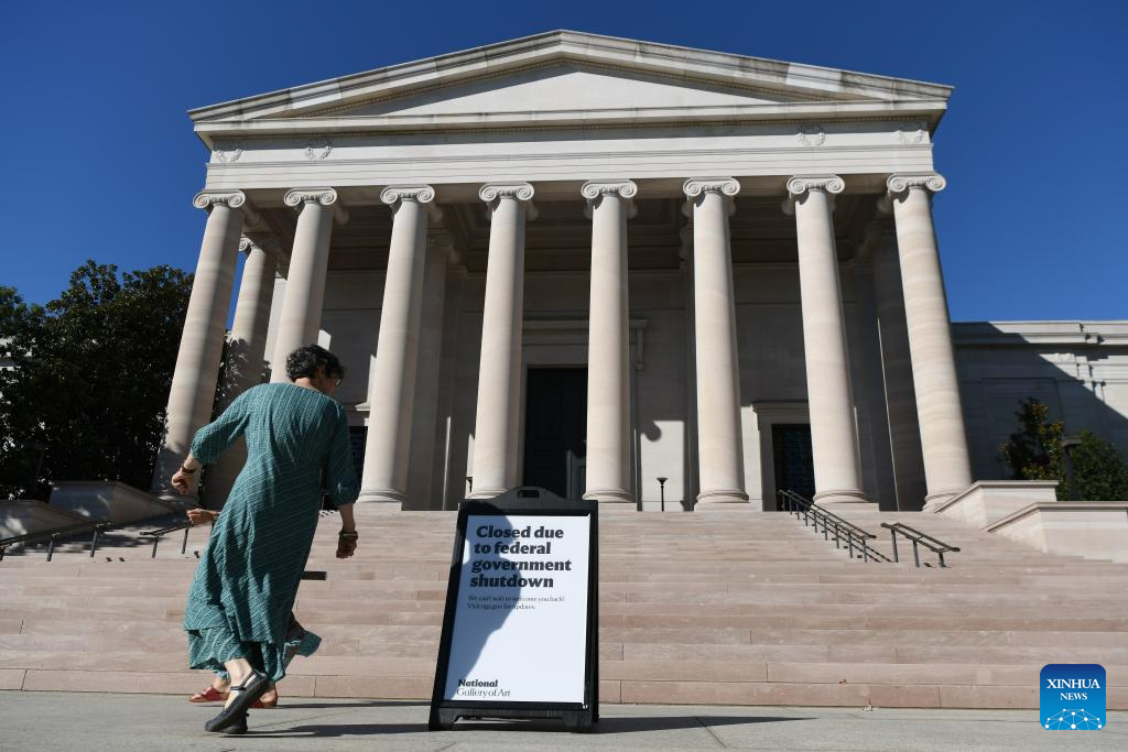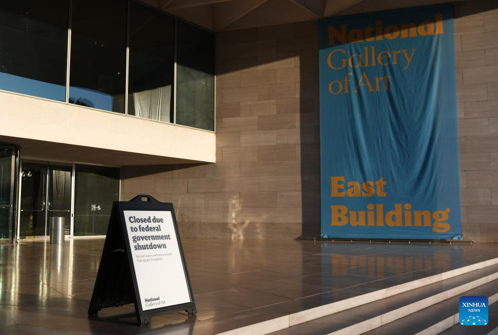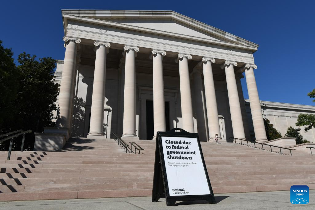 A notice of closure is seen in front of the National Gallery of Art in Washington, D.C., the United States, Oct. 5, 2025. As the U.S. federal government entered a shutdown -- the first time in nearly seven years -- the confrontation between President Donald Trump's administration and the Democratic Party has further escalated.