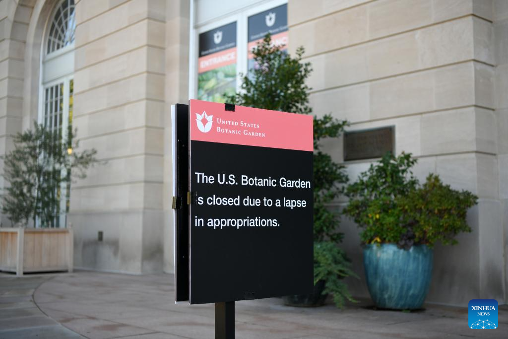 A notice of closure is seen at the entrance of the United States Botanic Garden in Washington, D.C., the United States, Oct. 5, 2025. As the U.S. federal government entered a shutdown -- the first time in nearly seven years -- the confrontation between President Donald Trump's administration and the Democratic Party has further escalated. The Trump administration has cut funding and programs in Democratic-led states and sought to dismantle federal agencies led by Democrats. Meanwhile, Democrats have shown a rare sense of unity, hoping to reverse declining approval ratings through the fight. This new round of partisan conflict over the government shutdown is markedly different from previous ones, characterized by greater hostility and malice that has pushed partisan strife to new heights. It highlights the deepening political polarization in the United States while inflicting greater harm on the American people. (Xinhua/Li Rui)
