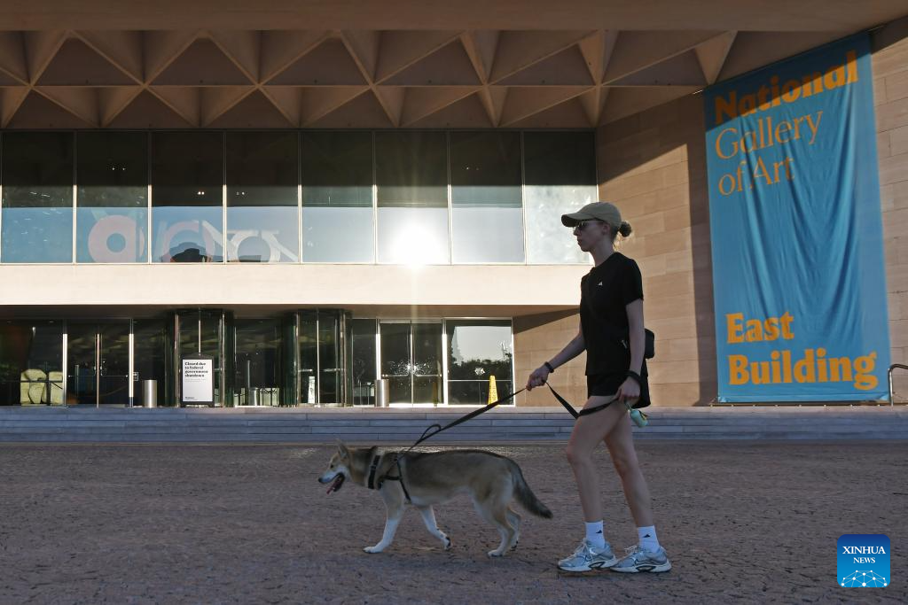 A woman walks a dog past the National Gallery of Art in Washington, D.C., the United States, Oct. 5, 2025. As the U.S. federal government entered a shutdown -- the first time in nearly seven years -- the confrontation between President Donald Trump's administration and the Democratic Party has further escalated.