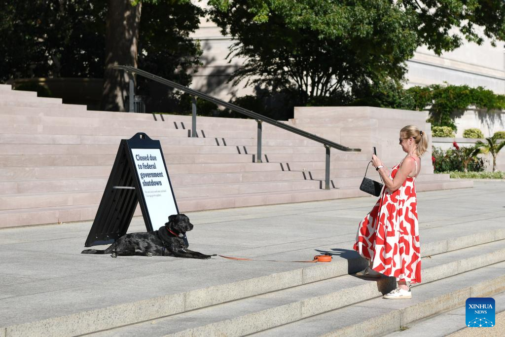 A woman takes photos of her dog next to a notice of closure of the National Gallery of Art in Washington, D.C., the United States, Oct. 5, 2025. As the U.S. federal government entered a shutdown -- the first time in nearly seven years -- the confrontation between President Donald Trump's administration and the Democratic Party has further escalated.