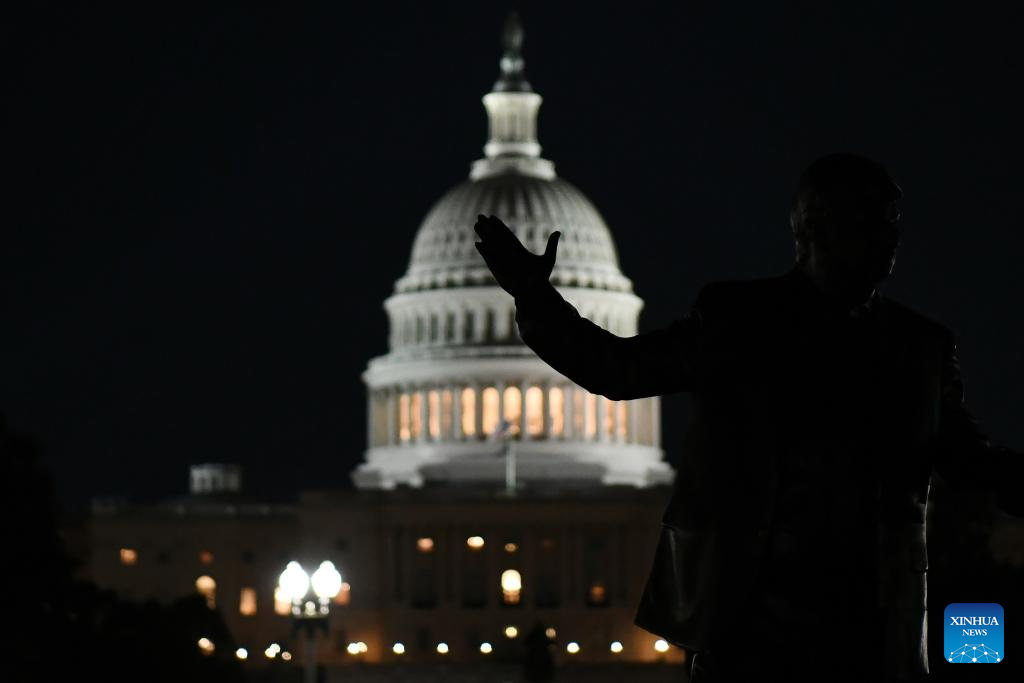 A hand of a sculpture is seen in front of the U.S. Capitol building in Washington, D.C., the United States, Oct. 5, 2025. As the U.S. federal government entered a shutdown -- the first time in nearly seven years -- the confrontation between President Donald Trump's administration and the Democratic Party has further escalated.