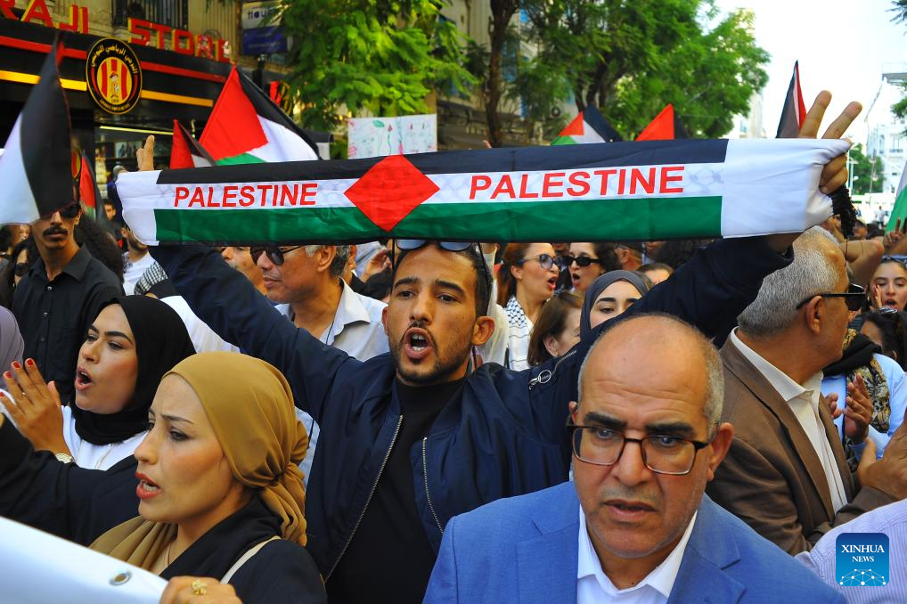 People gather to protest against Israel's interception of the Global Sumud Flotilla, at the center of Tunis, Tunisia, Oct. 4, 2025. Global Sumud Flotilla is an aid mission attempting to deliver humanitarian aid to Gaza. (Photo by Adel Ezzine/Xinhua)