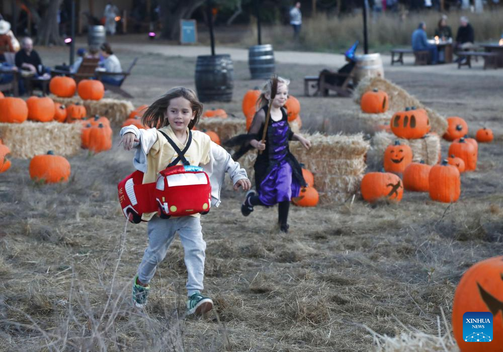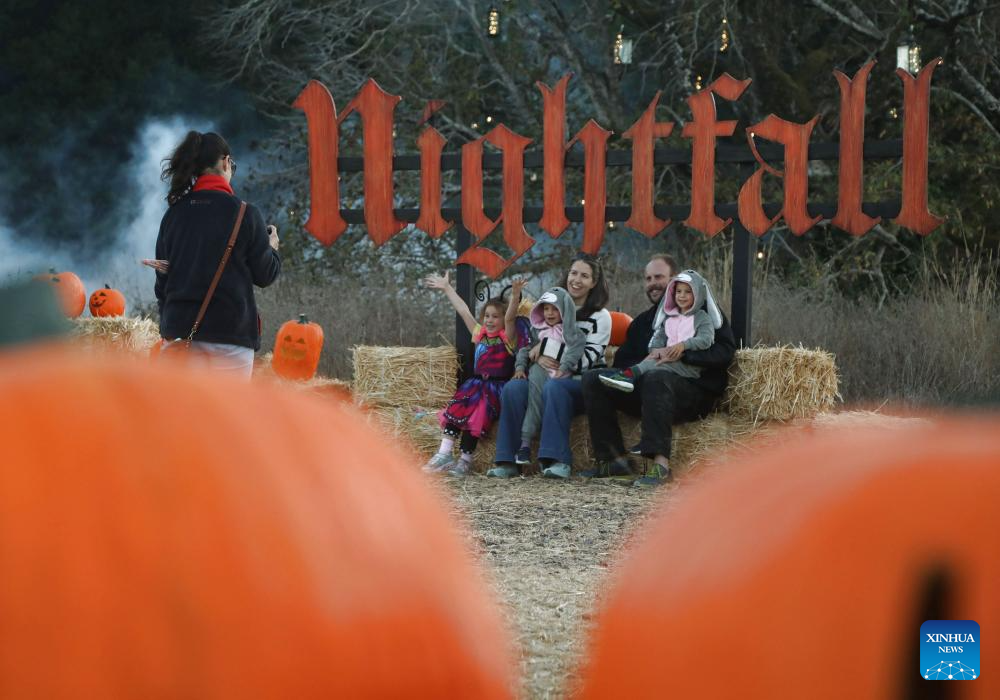 Young girls in festive attire attend the Nightfall event at the Filoli Historic House & Garden in Woodside, California, the United States, Oct. 3, 2025. The second Nightfall opened here on Friday and will last till Nov. 10. (Photo by Liu Yilin/Xinhua)