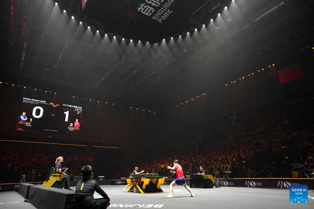 Wang Manyu and Sun Yingsha of China compete during their women's singles final match at 2025 World Table Tennis (WTT) China Smash in Beijing, China, Oct. 5, 2025. (Xinhua/Sun Fei)