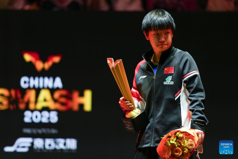 Runner-up Sun Yingsha of China reacts during the awarding ceremony for the women's singles event at 2025 World Table Tennis (WTT) China Smash in Beijing, China, Oct. 5, 2025. (Xinhua/Sun Fei)