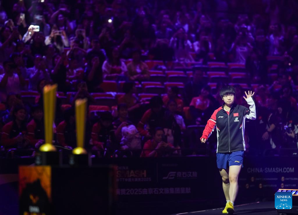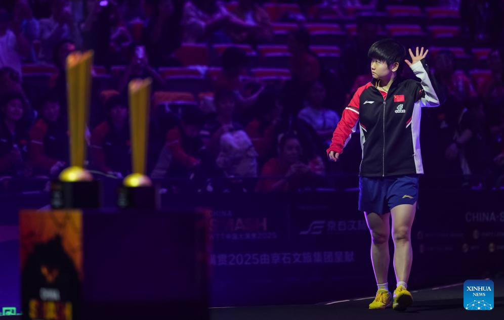 Wang Manyu enters the court before the women's singles final match between Sun Yingsha of China and Wang Manyu of China at 2025 World Table Tennis (WTT) China Smash in Beijing, China, Oct. 5, 2025. (Xinhua/Xie Han)