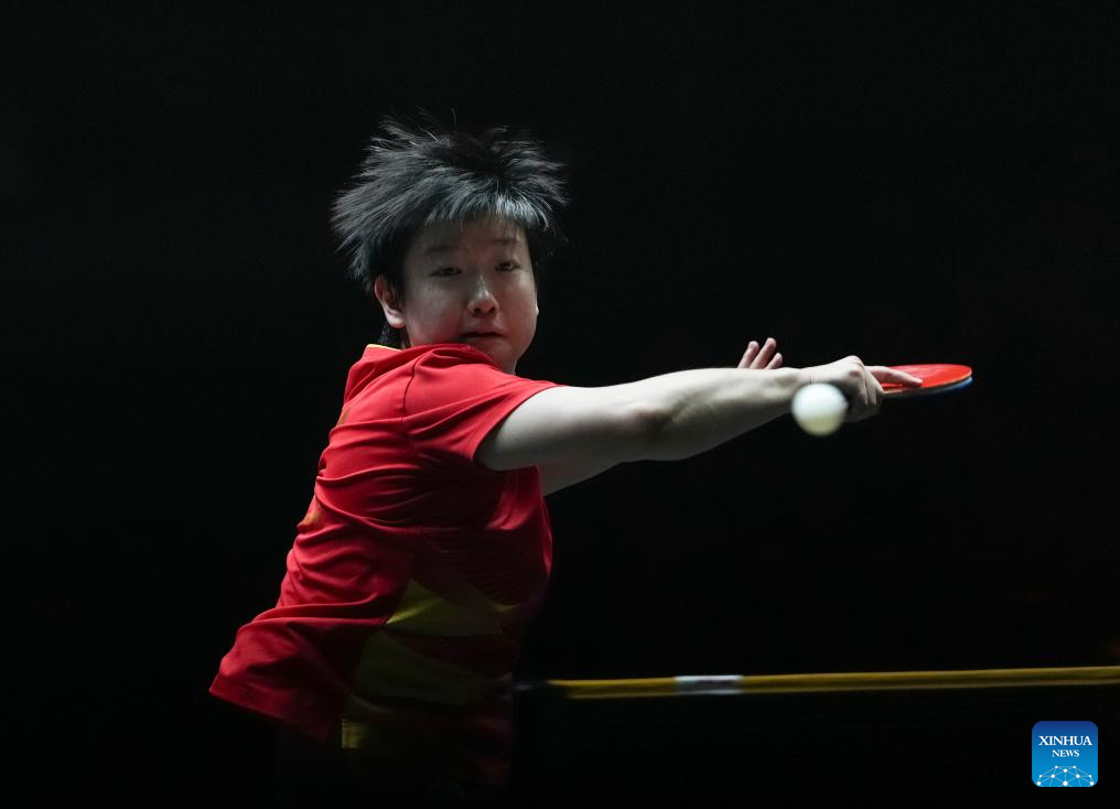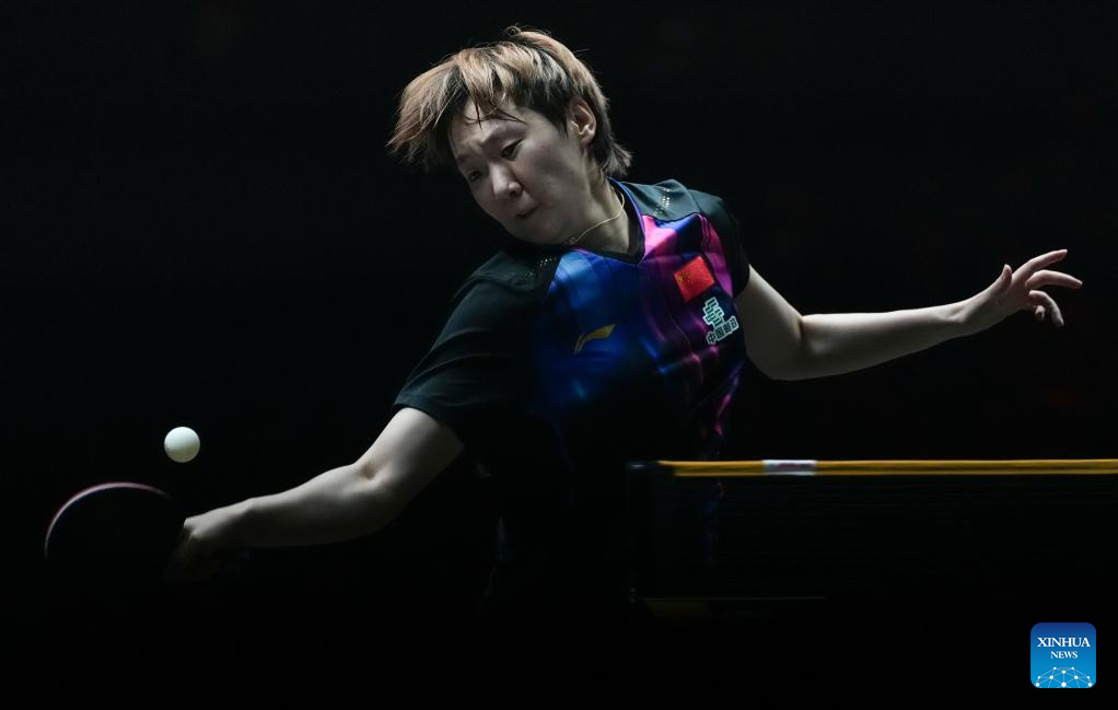 Sun Yingsha of China hits a return during the women's singles final match between Sun Yingsha of China and Wang Manyu of China at 2025 World Table Tennis (WTT) China Smash in Beijing, China, Oct. 5, 2025. (Xinhua/Sun Fei)
