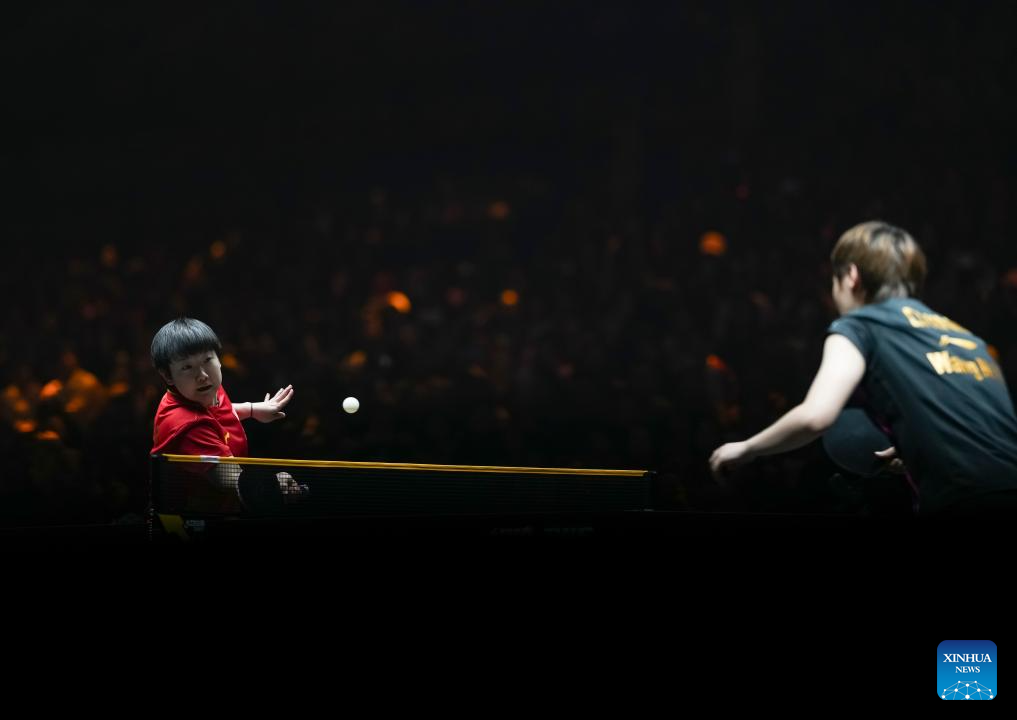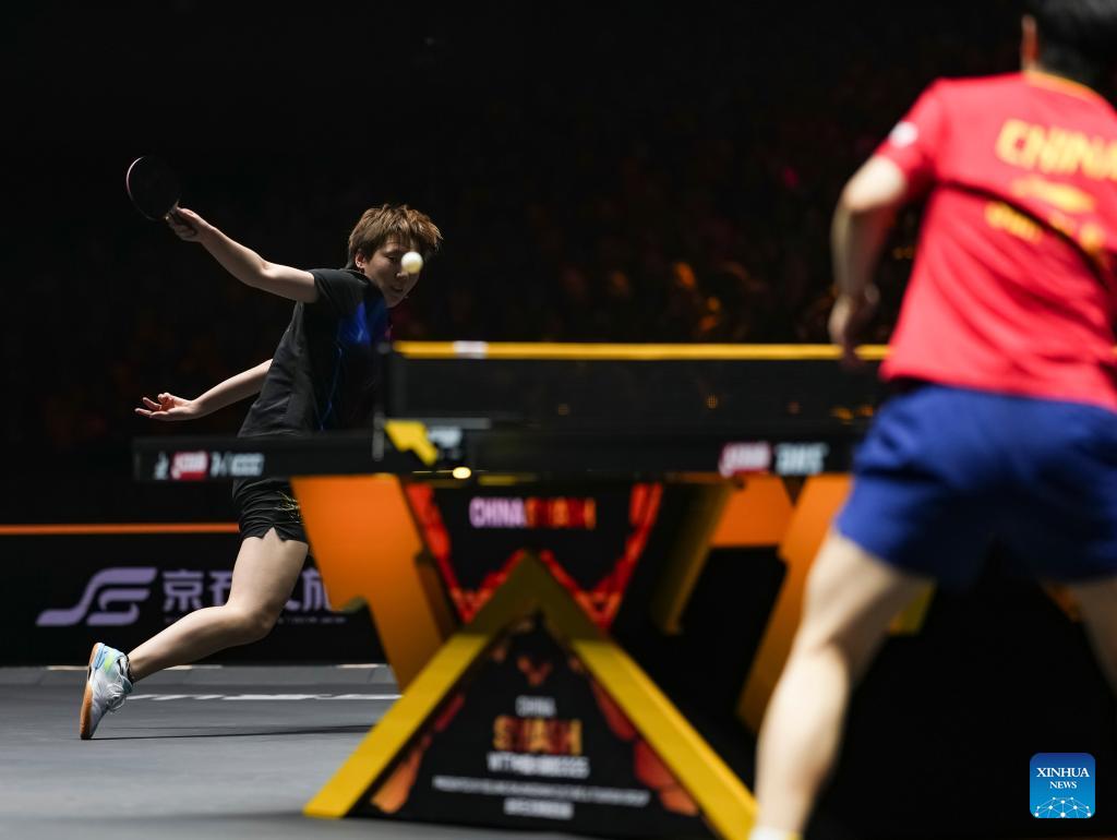 Sun Yingsha (L) hits a return during the women's singles final match between Sun Yingsha of China and Wang Manyu of China at 2025 World Table Tennis (WTT) China Smash in Beijing, China, Oct. 5, 2025. (Xinhua/Sun Fei)
