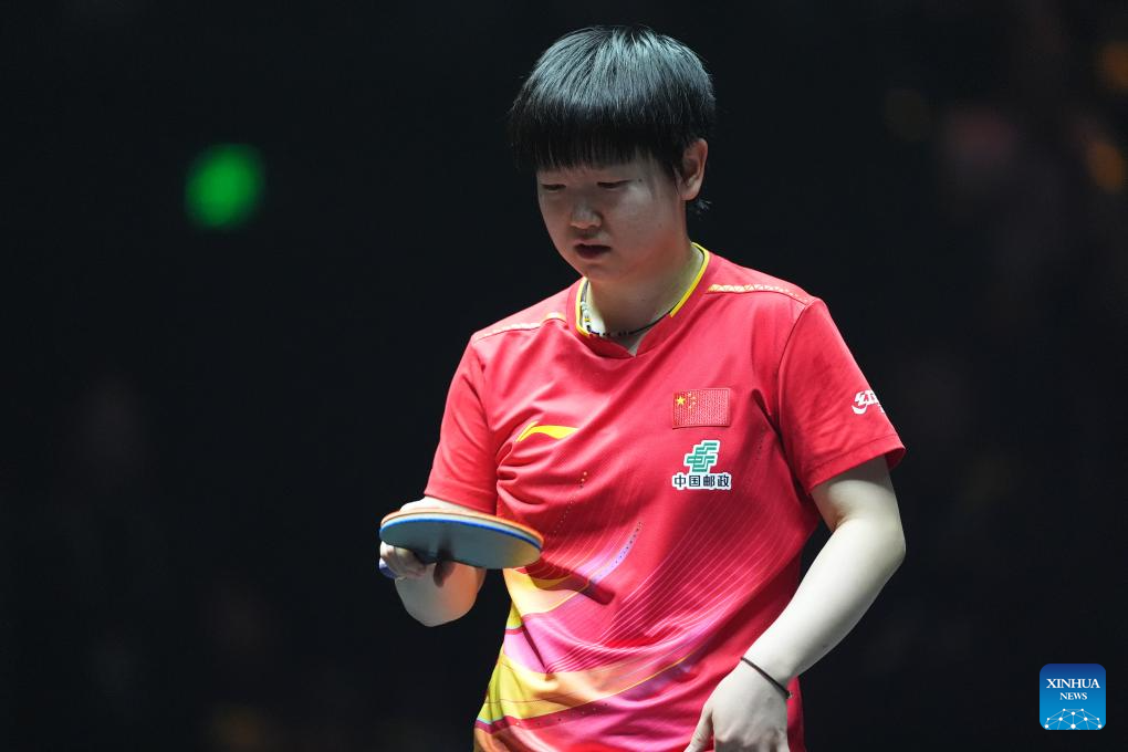 Wang Manyu of China reacts during the women's singles final match between Sun Yingsha of China and Wang Manyu of China at 2025 World Table Tennis (WTT) China Smash in Beijing, China, Oct. 5, 2025. (Xinhua/Sun Fei)