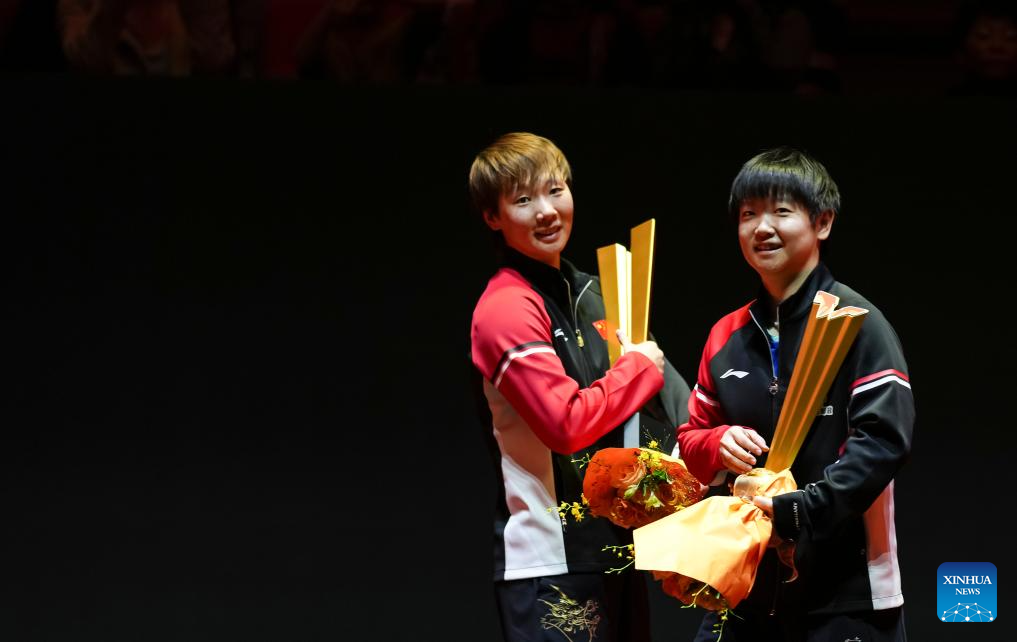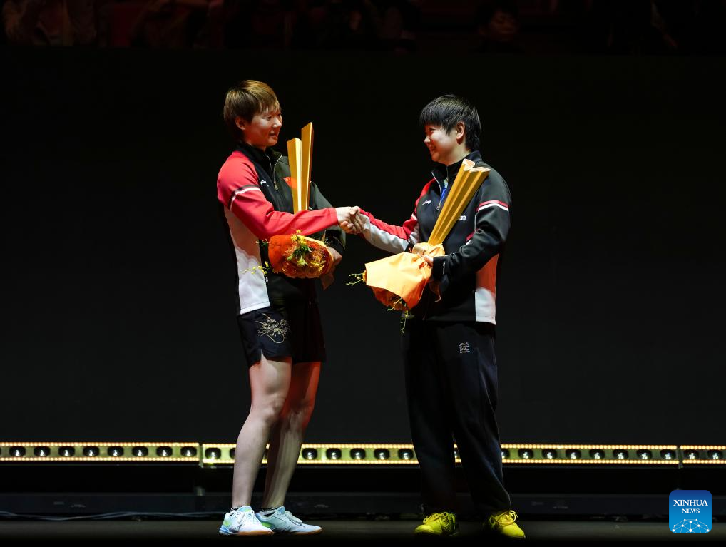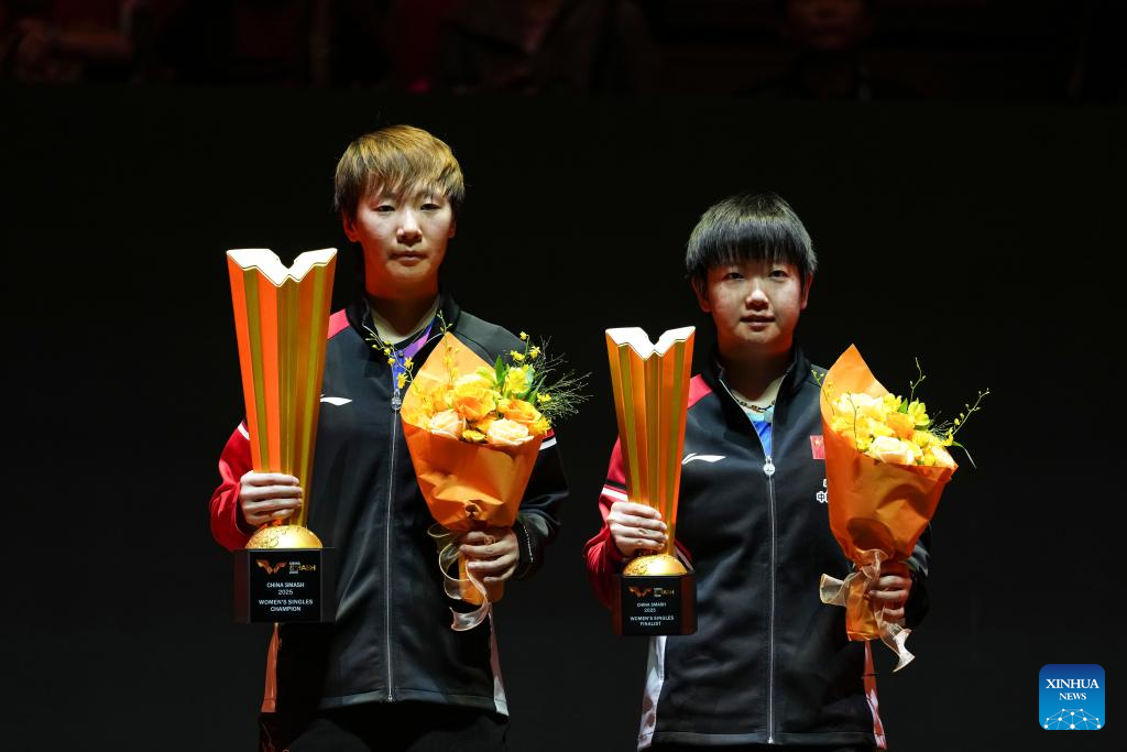 Winner Wang Manyu (L) and runner-up Sun Yingsha of China pose during the awarding ceremony for the women's singles event at 2025 World Table Tennis (WTT) China Smash in Beijing, China, Oct. 5, 2025. (Xinhua/Sun Fei)