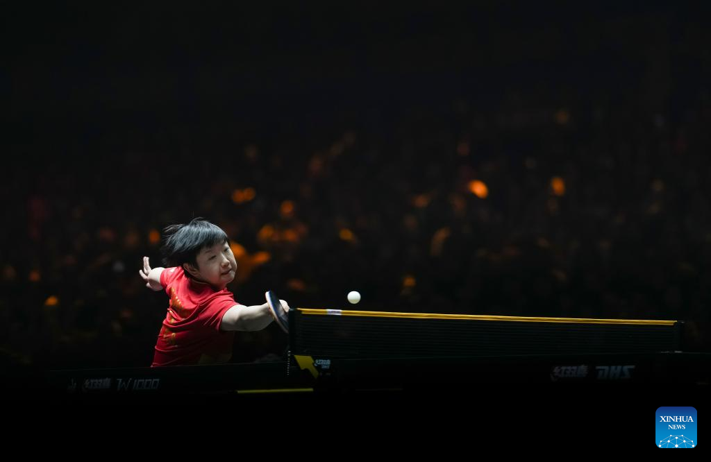Sun Yingsha hits a return during the women's singles final match between Sun Yingsha of China and Wang Manyu of China at 2025 World Table Tennis (WTT) China Smash in Beijing, China, Oct. 5, 2025. (Xinhua/Sun Fei)