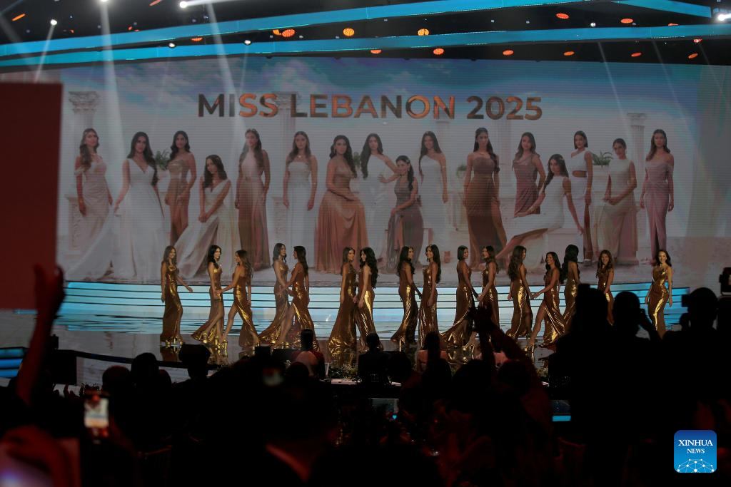 Contestants are seen on the stage in the Miss Lebanon 2025 contest in Beirut, Lebanon, on Oct. 4, 2025. Miss Lebanon is Lebanon's national beauty pageant. This year, Lebanon crowned 22-year-old Perla Harb as its beauty queen for the year 2025 during a ceremony held on Saturday evening. (Photo by Bilal Jawich/Xinhua)