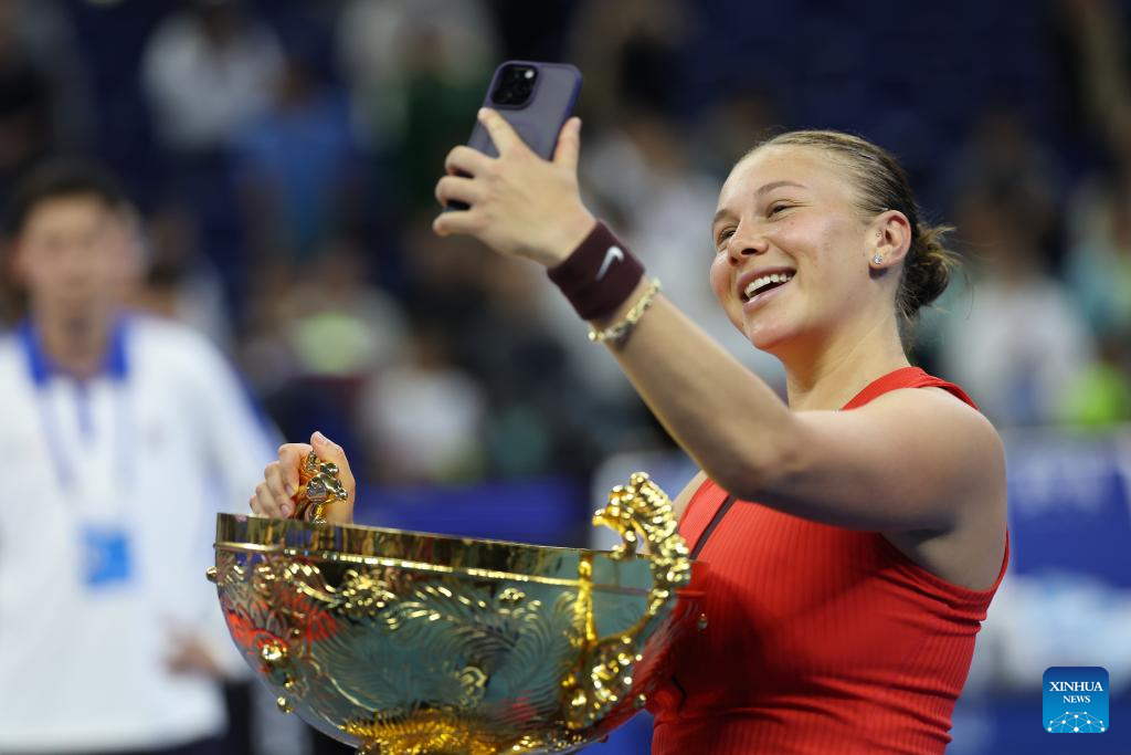 Amanda Anisimova takes a selfie during the awarding ceremony after the women's singles final match between Amanda Anisimova of the United States and Linda Noskova of the Czech Republic at 2025 China Open tennis tournament in Beijing, China, Oct. 5, 2025. (Xinhua/Bai Xuefei)