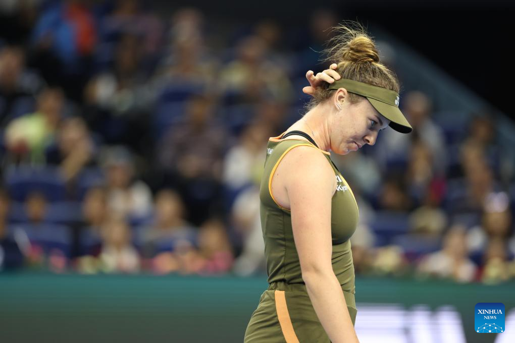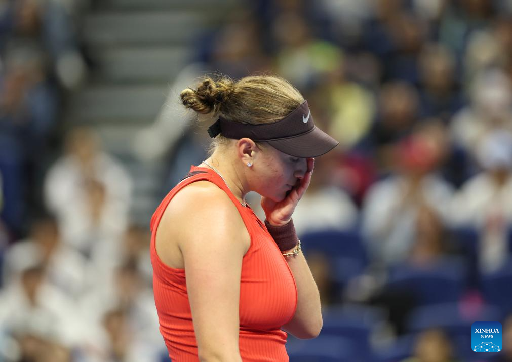 Linda Noskova reacts during the women's singles final match between Amanda Anisimova of the United States and Linda Noskova of the Czech Republic at 2025 China Open tennis tournament in Beijing, China, Oct. 5, 2025. (Xinhua/Bai Xuefei)