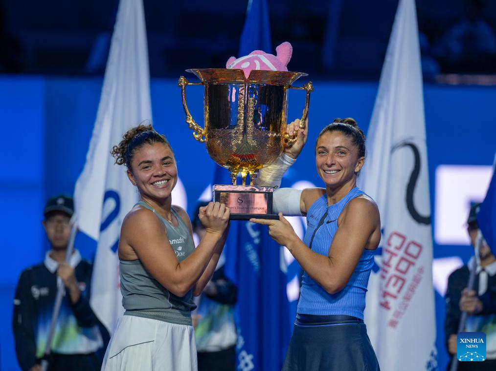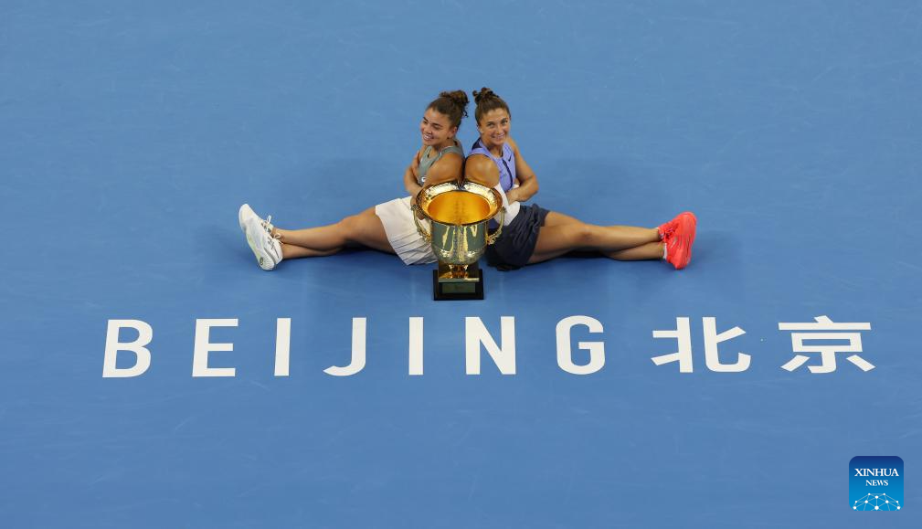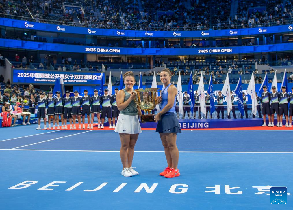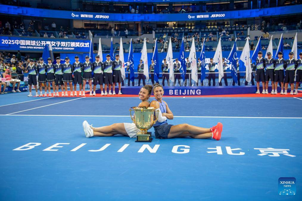 Sara Errani/Jasmine Paolini (L) pose for photos during the awarding ceremony for the women's doubles final between Kato Miyu (Japan)/Fanny Stollar (Hungary) and Sara Errani/Jasmine Paolini of Italy at 2025 China Open tennis tournament in Beijing, China, Oct. 5, 2025. (Xinhua/Hu Jingwen)