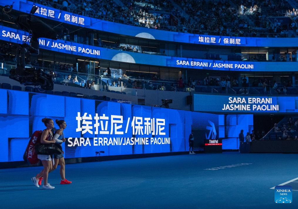 Sara Errani/Jasmine Paolini (L) enter the court before the women's doubles final between Kato Miyu (Japan)/Fanny Stollar (Hungary) and Sara Errani/Jasmine Paolini of Italy at 2025 China Open tennis tournament in Beijing, China, Oct. 5, 2025. (Xinhua/Hu Jingwen)