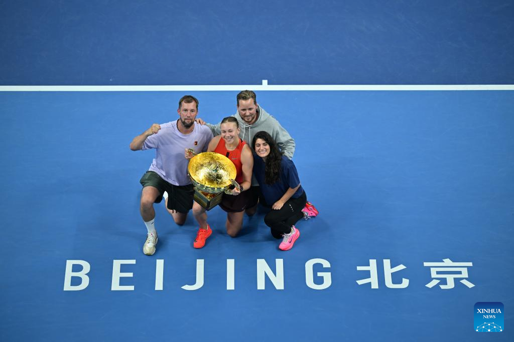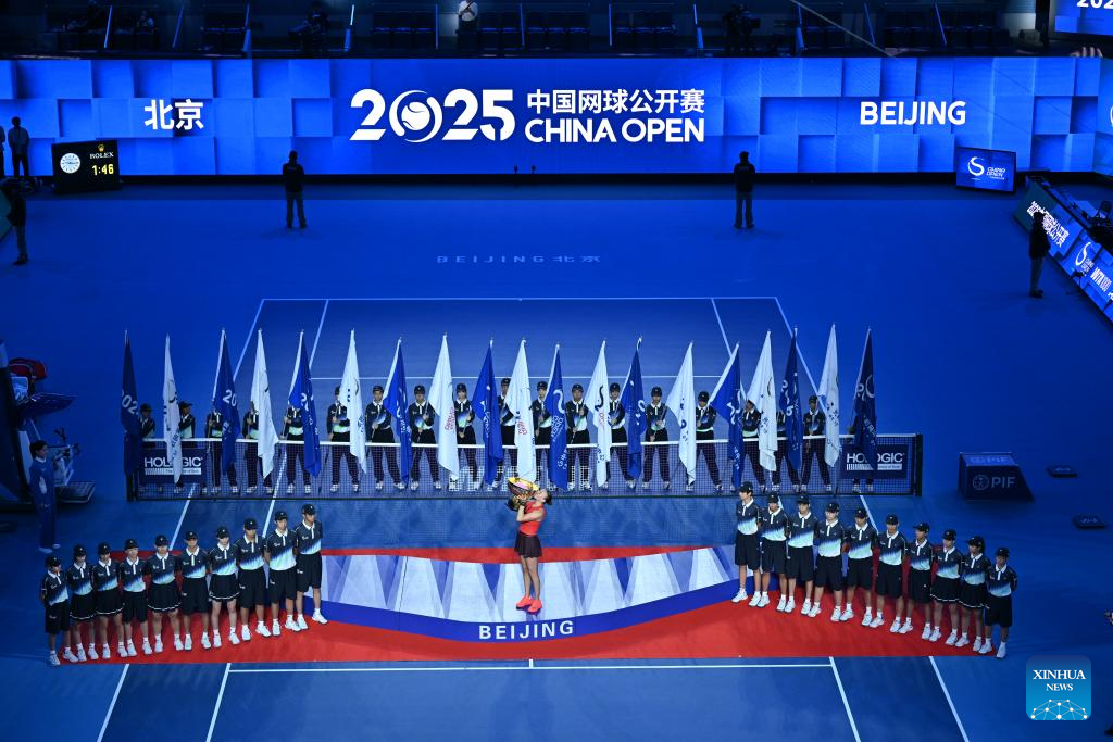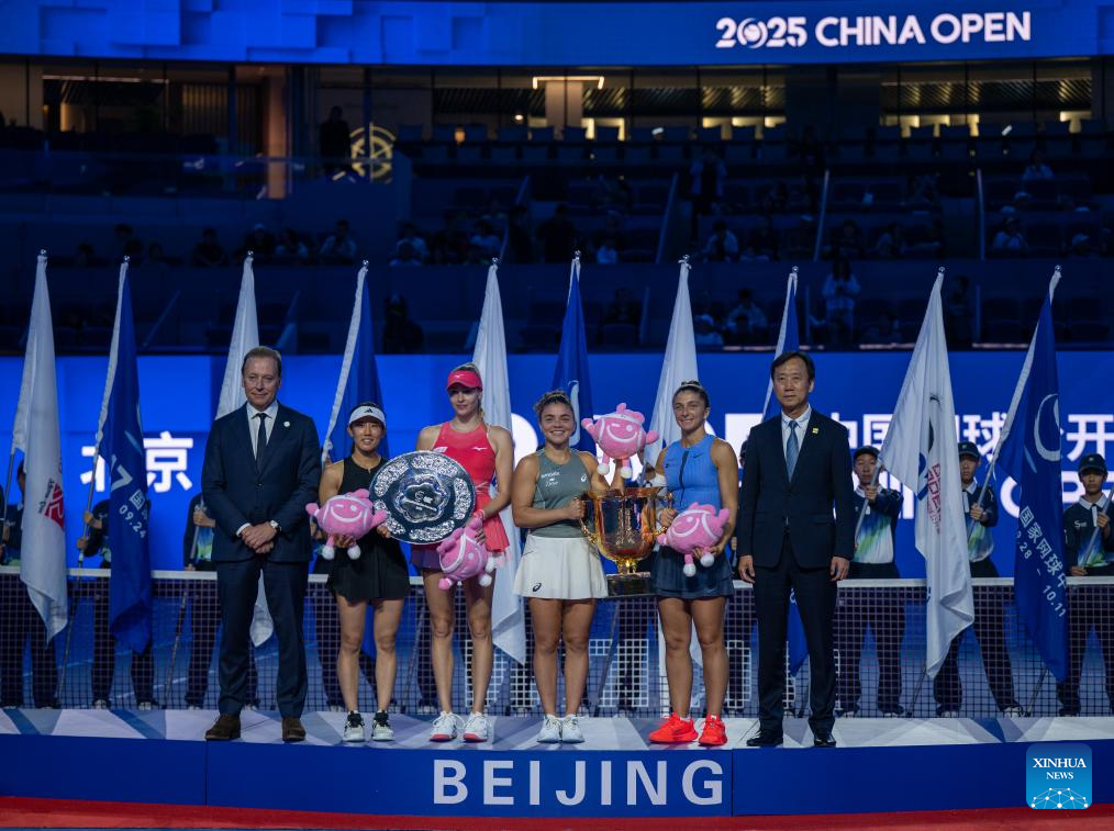 Amanda Anisimova (2nd L) celebrates during the awarding ceremony after the women's singles final match between Amanda Anisimova of the United States and Linda Noskova of the Czech Republic at 2025 China Open tennis tournament in Beijing, China, Oct. 5, 2025. (Xinhua/Hu Jingwen)