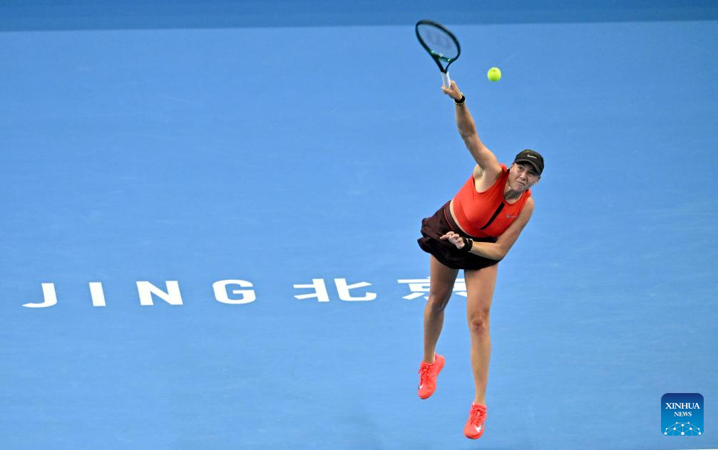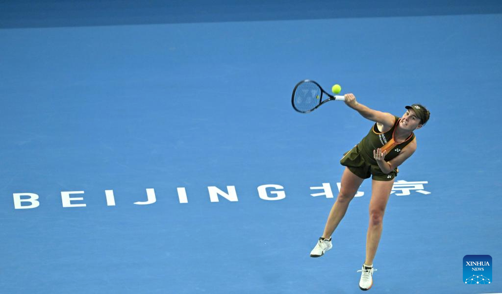 Linda Noskova serves during the women's singles final match between Amanda Anisimova of the United States and Linda Noskova of the Czech Republic at 2025 China Open tennis tournament in Beijing, China, Oct. 5, 2025. (Xinhua/Hu Jingwen)
