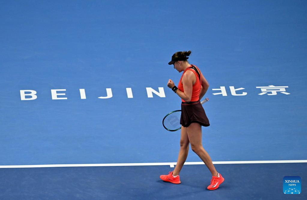 Linda Noskova celebrates scoring during the women's singles final match between Amanda Anisimova of the United States and Linda Noskova of the Czech Republic at 2025 China Open tennis tournament in Beijing, China, Oct. 5, 2025. (Xinhua/Hu Jingwen)