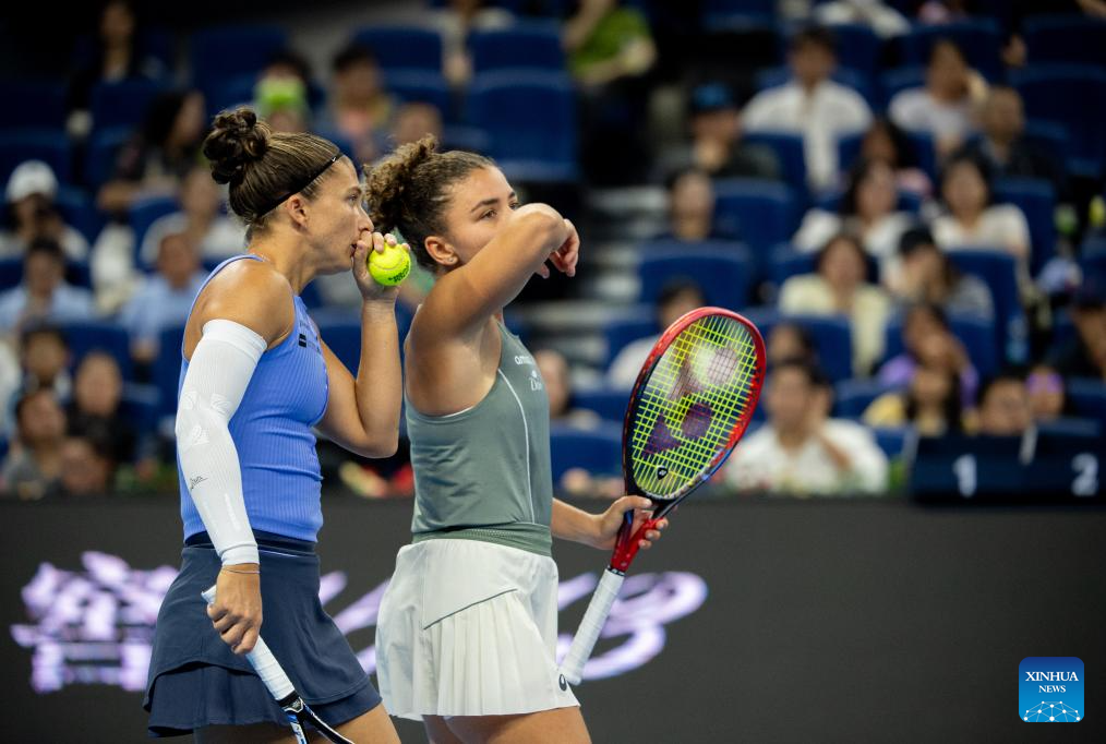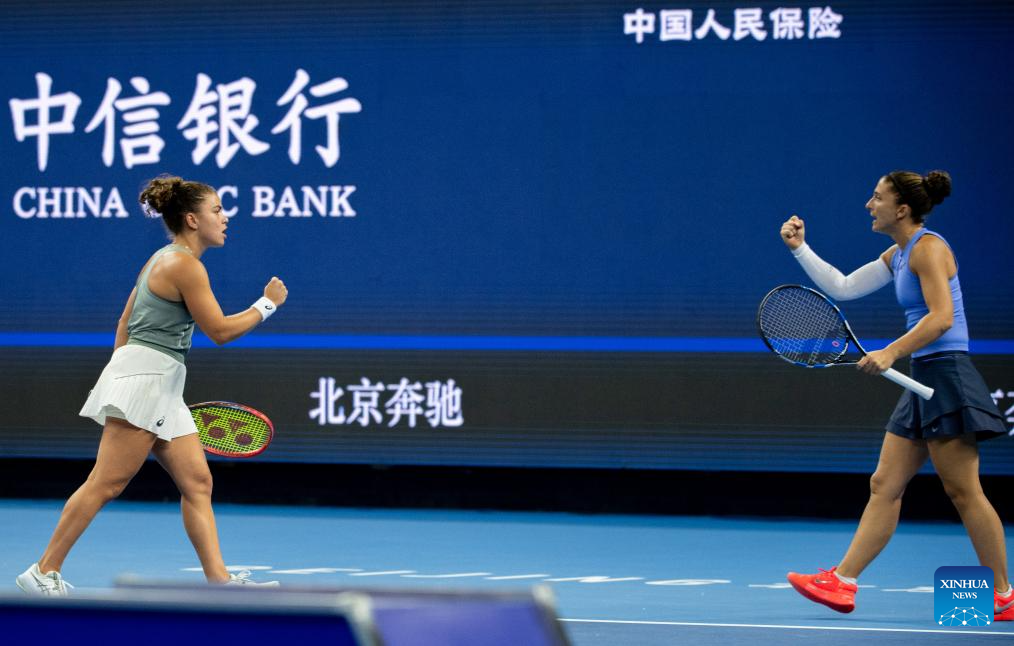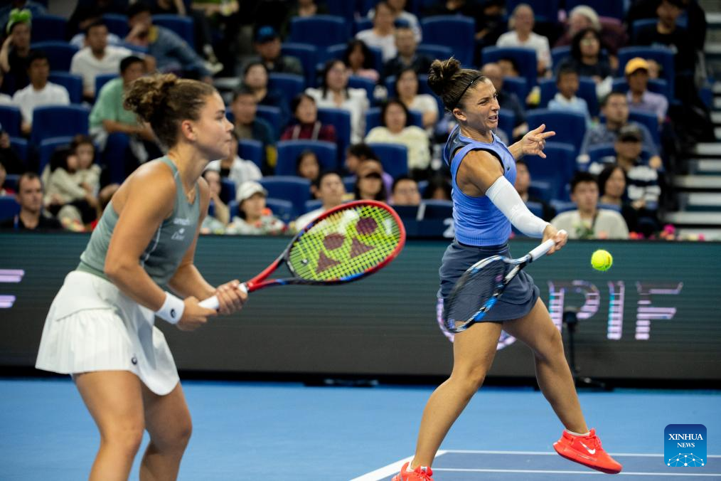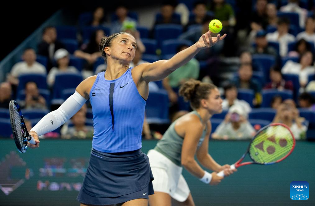 Sara Errani (R)/Jasmine Paolini compete during the women's doubles final between Kato Miyu (Japan)/Fanny Stollar (Hungary) and Sara Errani/Jasmine Paolini of Italy at 2025 China Open tennis tournament in Beijing, China, Oct. 5, 2025. (Xinhua/Hu Jingwen)