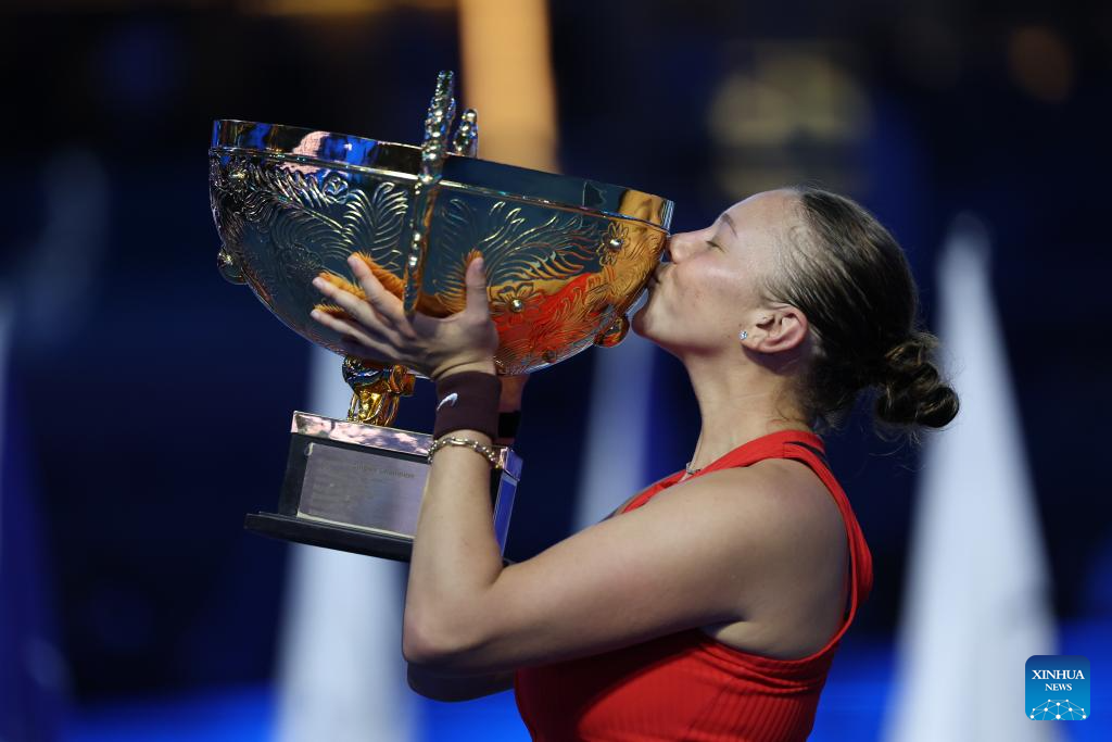 Amanda Anisimova kisses the trophy during the awarding ceremony after the women's singles final match between Amanda Anisimova of the United States and Linda Noskova of the Czech Republic at 2025 China Open tennis tournament in Beijing, China, Oct. 5, 2025. (Xinhua/Bai Xuefei)