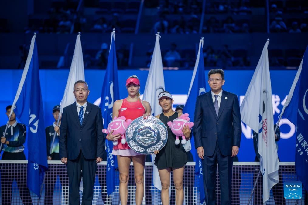 Winner Amanda Anisimova (R) and runner-up Linda Noskova pose for photos during the awarding ceremony after the women's singles final match between Amanda Anisimova of the United States and Linda Noskova of the Czech Republic at 2025 China Open tennis tournament in Beijing, China, Oct. 5, 2025. (Xinhua/Bai Xuefei)