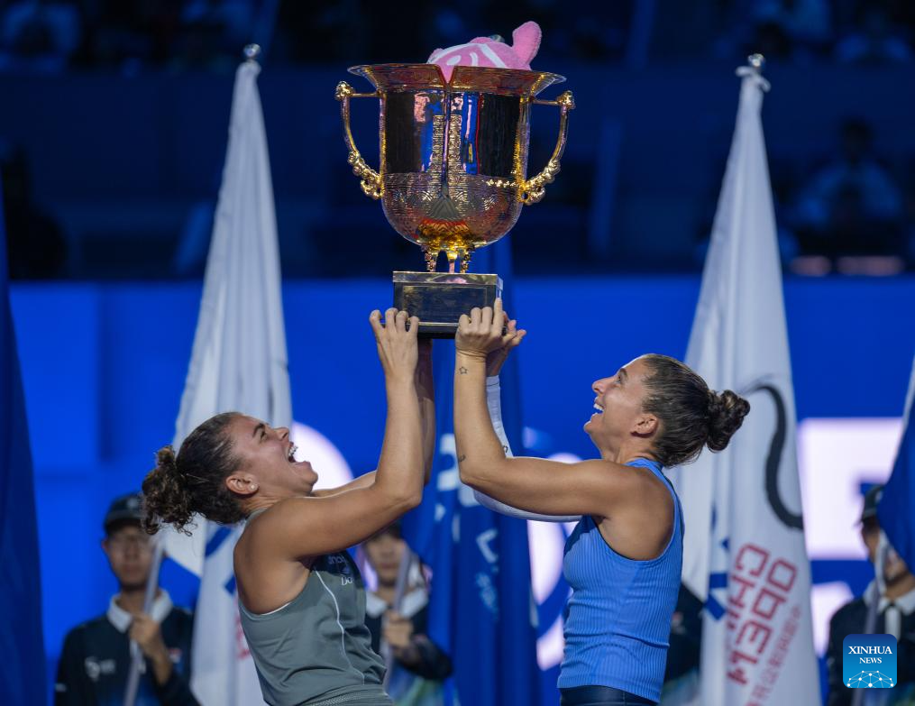 Sara Errani/Jasmine Paolini (R) celebrate winning the women's doubles final between Kato Miyu (Japan)/Fanny Stollar (Hungary) and Sara Errani/Jasmine Paolini of Italy at 2025 China Open tennis tournament in Beijing, China, Oct. 5, 2025. (Xinhua/Hu Jingwen)