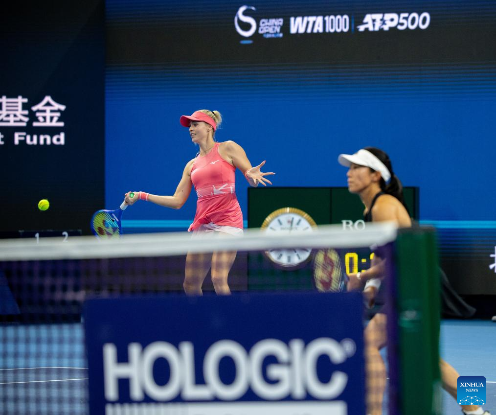 Kato Miyu/Fanny Stollar (R) compete during the women's doubles final between Kato Miyu (Japan)/Fanny Stollar (Hungary) and Sara Errani/Jasmine Paolini of Italy at 2025 China Open tennis tournament in Beijing, China, Oct. 5, 2025. (Xinhua/Hu Jingwen)