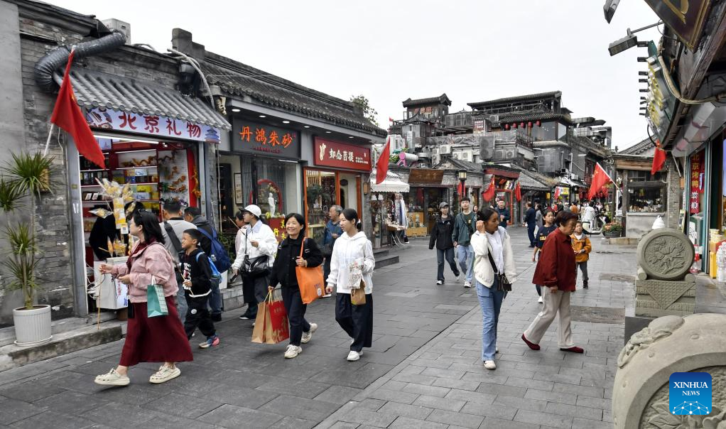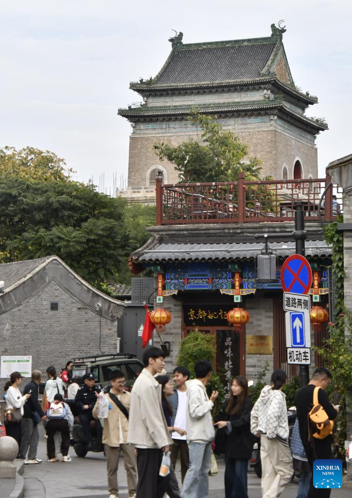 Tourists are seen in an alley in Beijing, capital of China, Oct. 6, 2025. As China's National Day and Mid-Autumn Festival holidays converge, the nation's cultural activities, bustling transport networks and innovative consumption scenes are painting a vivid picture of economic resilience and growth potential. (Xinhua/Li Xin)