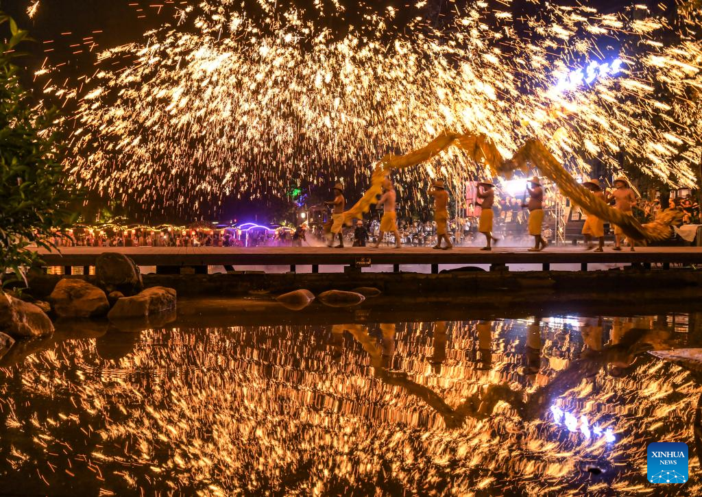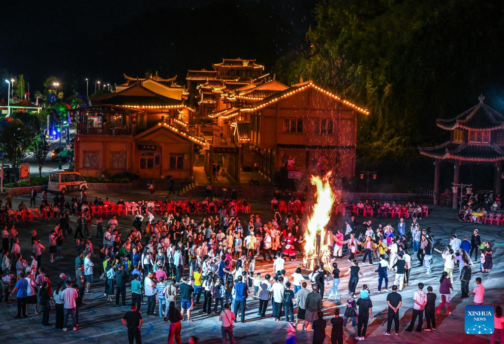 Tourists and locals dance around a bonfire at a scenic spot in Qinglong County, southwest China's Guizhou Province, Oct. 5, 2025. As China's National Day and Mid-Autumn Festival holidays converge, the nation's cultural activities, bustling transport networks and innovative consumption scenes are painting a vivid picture of economic resilience and growth potential. (Xinhua/Yang Wenbin)